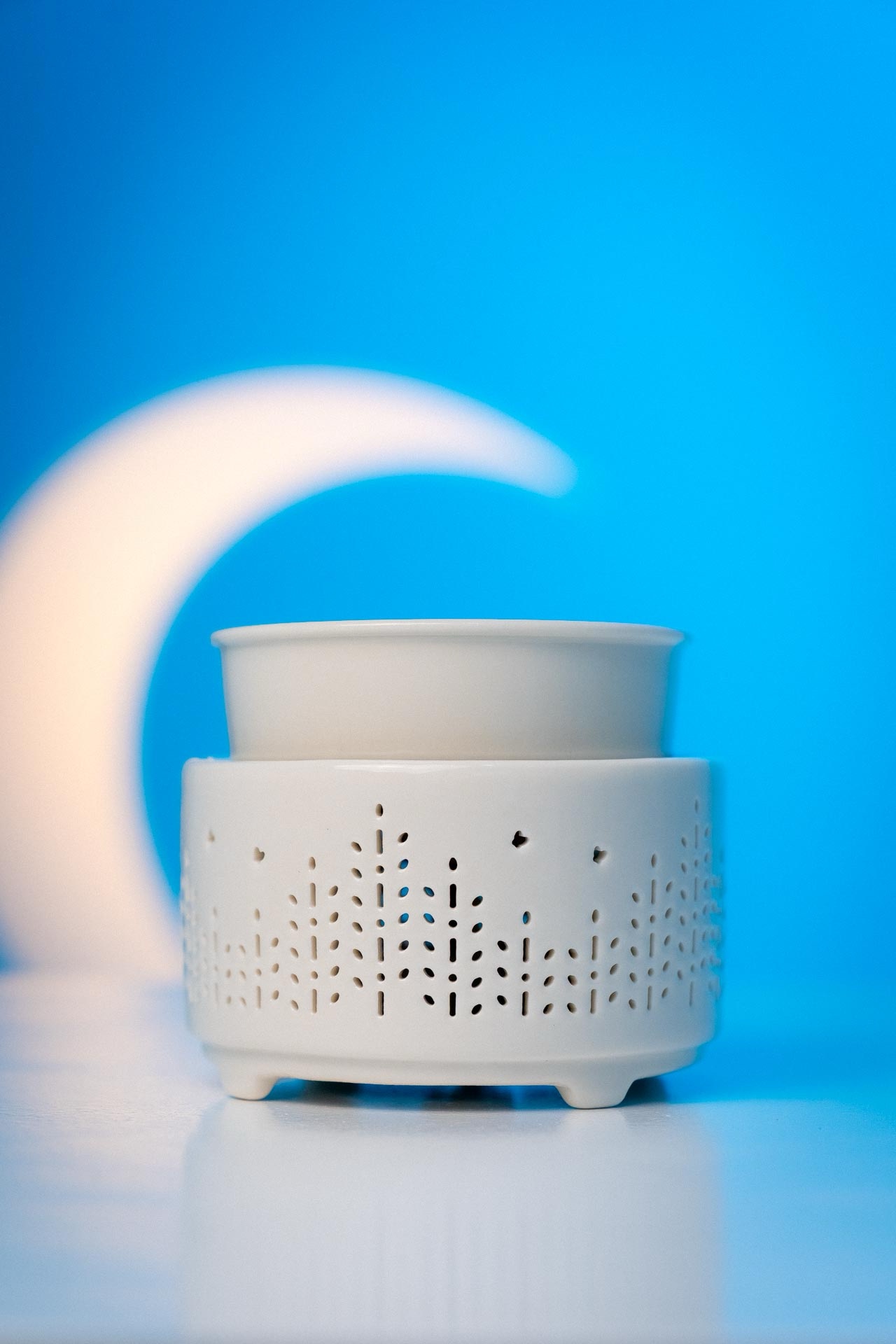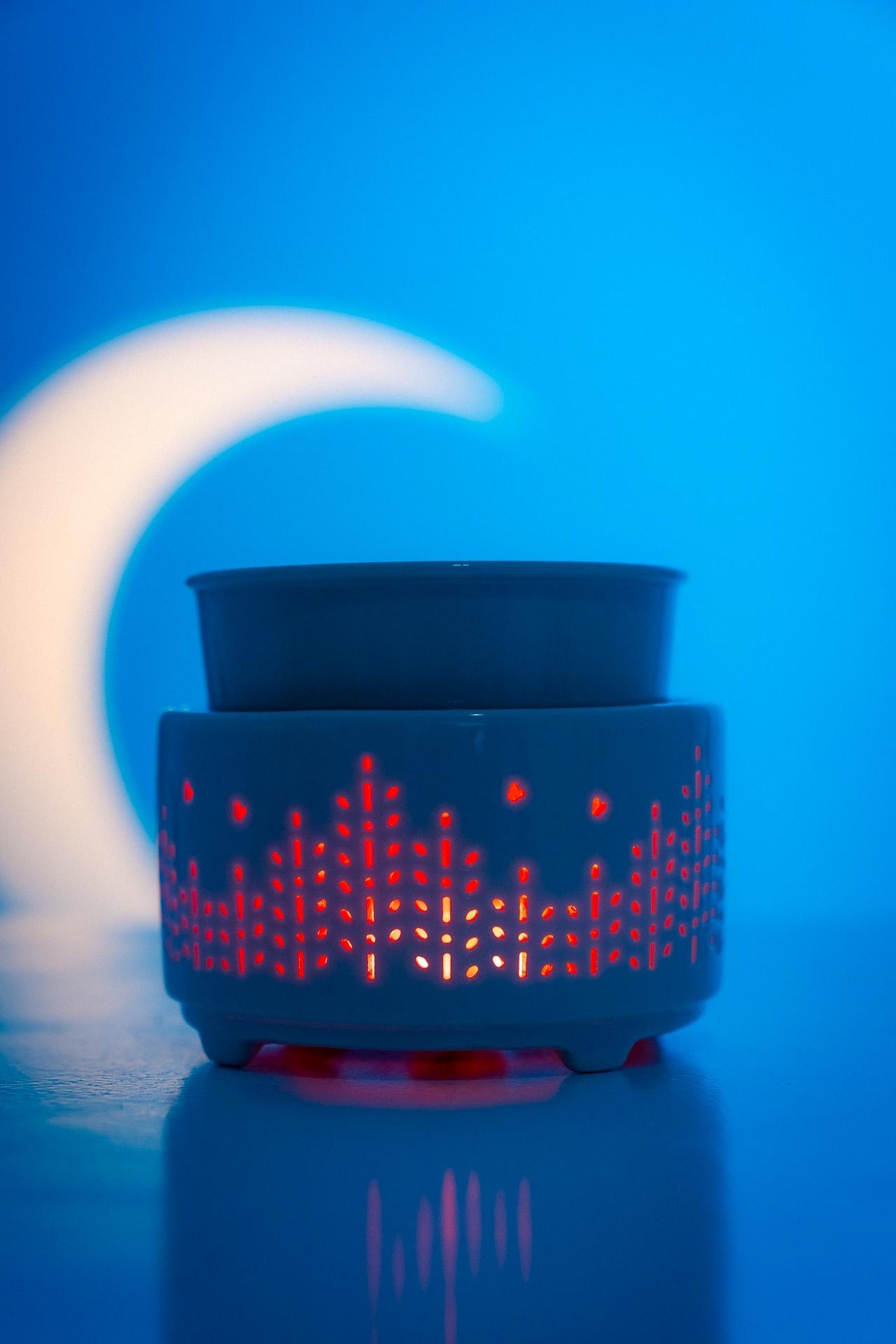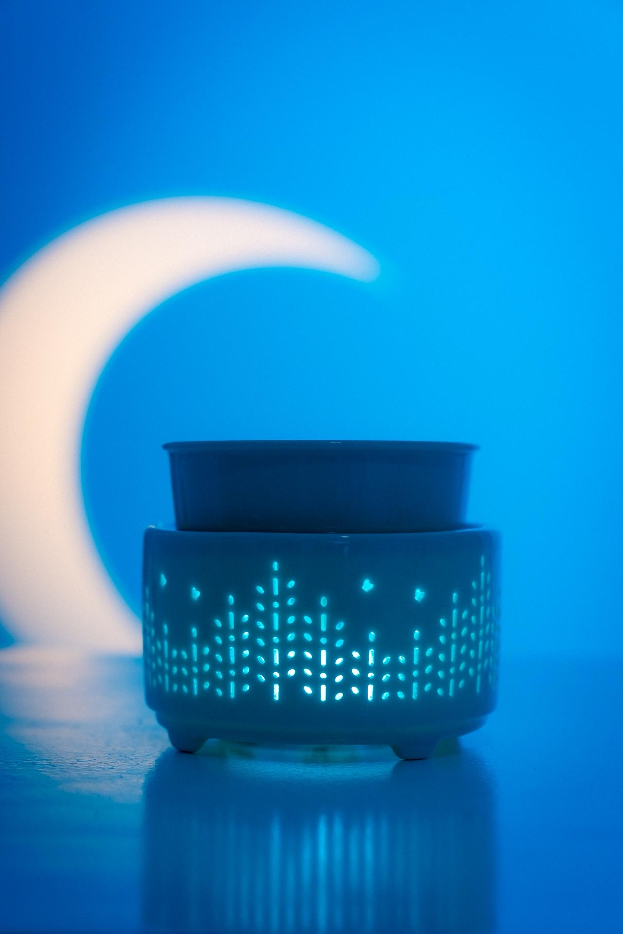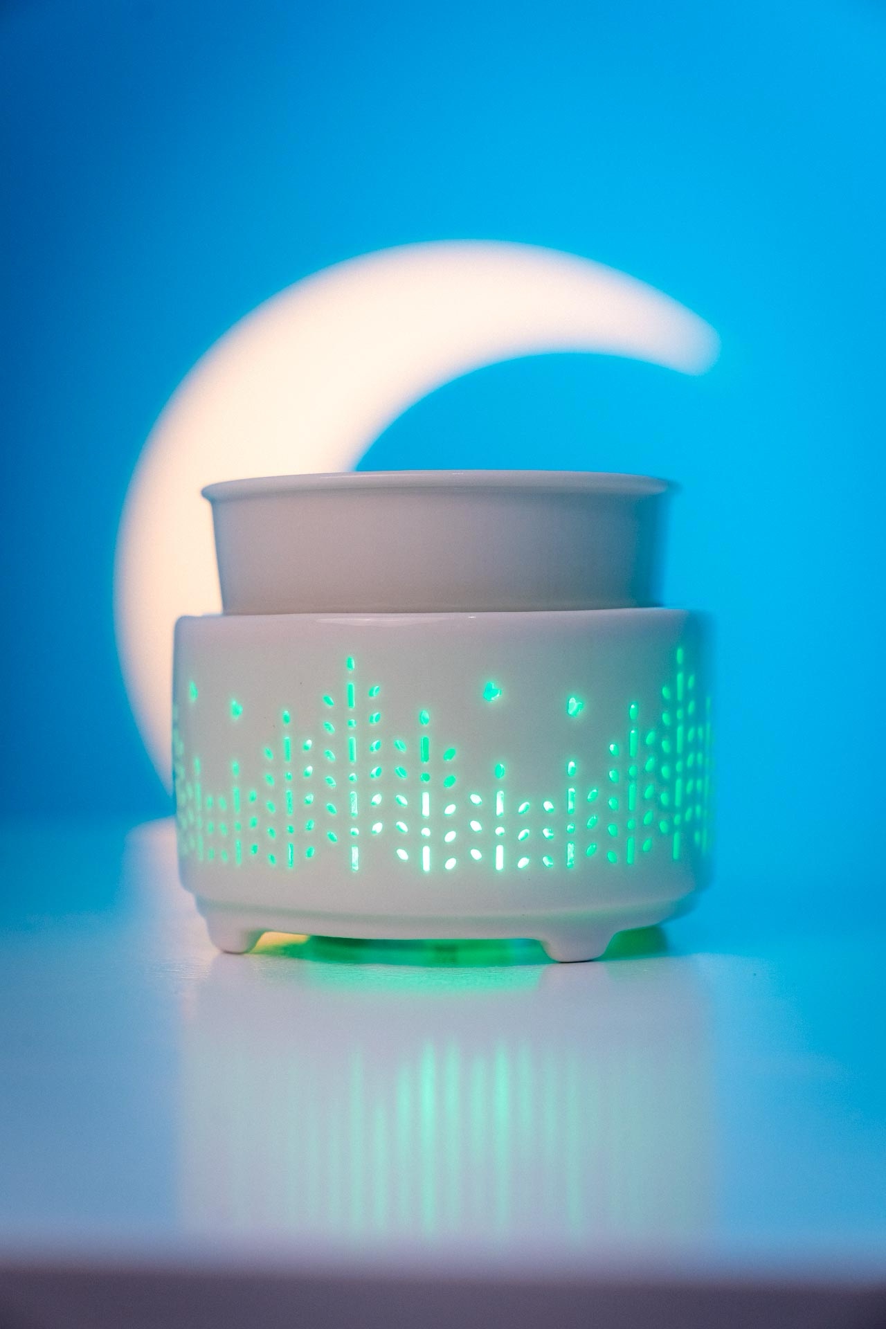 *Diseño calado que proyecta formas de luz mientras perfuma tu hogar.*